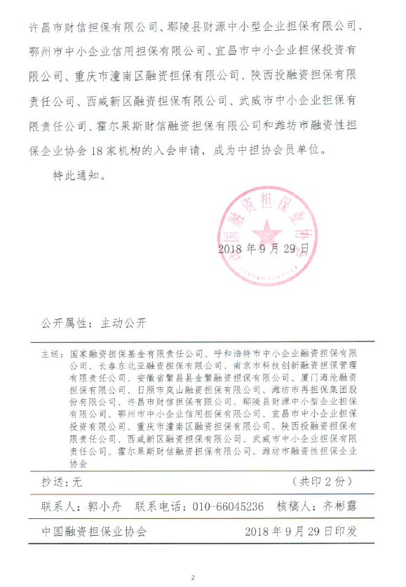 我集團(tuán)全資子公司長(zhǎng)春東北亞融資擔(dān)保有限公司自7月26日注冊(cè)成立以來(lái),相繼完成了業(yè)務(wù)流程設(shè)計(jì)、制度體系搭建、人員招聘、軟硬件設(shè)施建設(shè)等一系列業(yè)務(wù)開(kāi)展前期準(zhǔn)備工作。為了及時(shí)把握政策動(dòng)態(tài),提高公司規(guī)范化管理水平,加強(qiáng)與業(yè)內(nèi)其他機(jī)構(gòu)的交流與協(xié)作,擔(dān)保公司向中國(guó)融資擔(dān)保業(yè)協(xié)會(huì)遞交了成為會(huì)員單位的申請(qǐng)。9月29日,擔(dān)保公司收到了《中國(guó)融資擔(dān)保業(yè)協(xié)會(huì)關(guān)于批準(zhǔn)東北中小企業(yè)信用再擔(dān)保股份有限公司等23家機(jī)構(gòu)成為副會(huì)長(zhǎng)、理事、會(huì)員單位的通知》,正式成為中國(guó)融資擔(dān)保業(yè)協(xié)會(huì)會(huì)員單位。